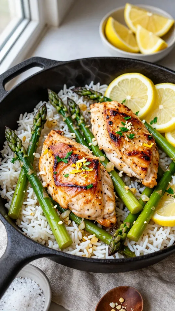 This bright, zesty skillet practically sings with citrus and garlic. It’s a perfect pick-me-up for busy weeknights, and the clean flavors make it a crowd-pleaser. You’ll get juicy chicken, crisp-tender asparagus, and fluffy rice in one pan—aka dinner magic.