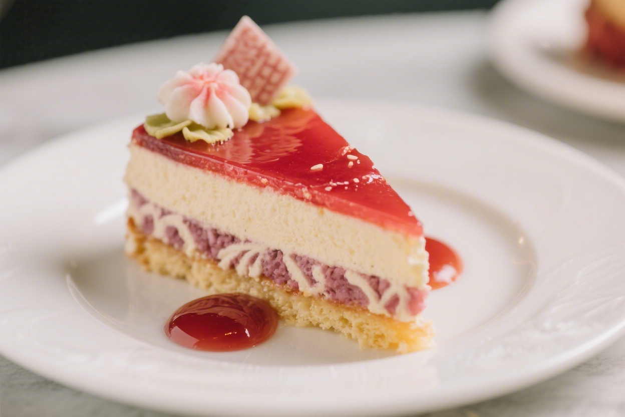 Final plated slice detail: Close-up of a single, clean-cut slice of berry mousse cake on a matte whi